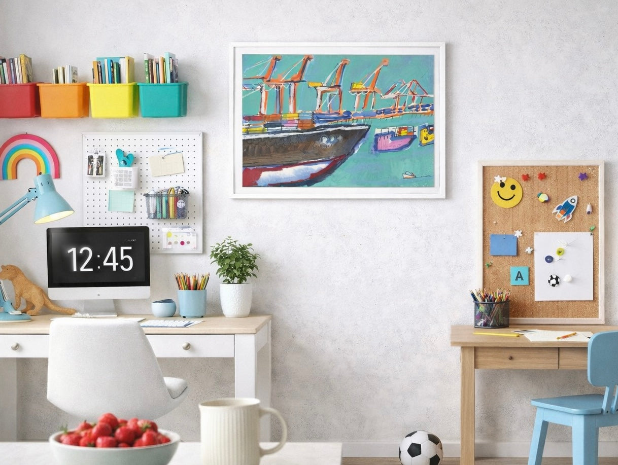 A bright and abstract capture of Fremantle shipping container and port cranes. Perfect for a kids room or a room looking for some big life energy!